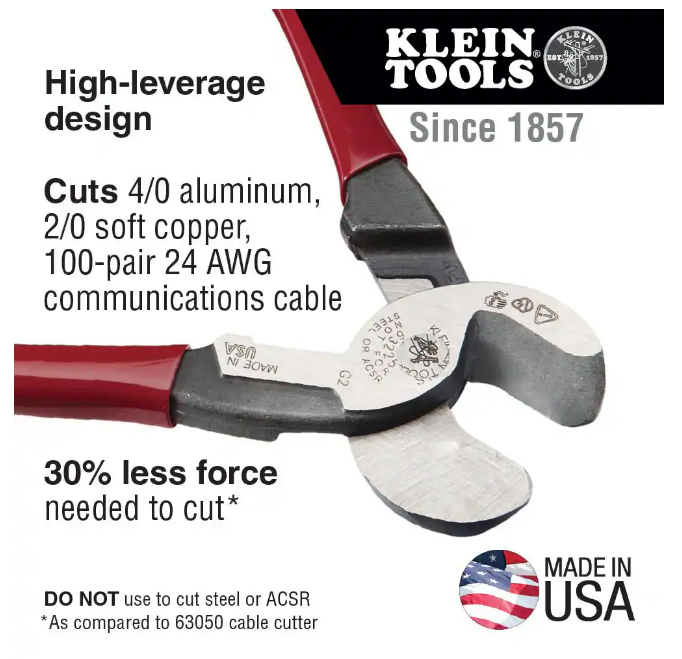 - Cable cutter cuts 4/0 aluminum, 2/0 soft copper, 100-pair 24 AWG communications cable.