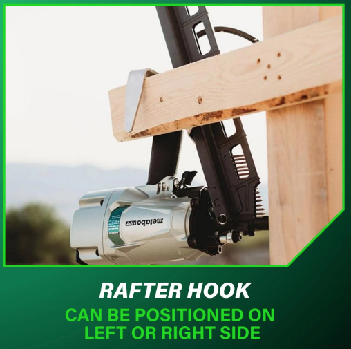 - RAFTER HOOK: Can be positioned on left or right side depending on user preference.