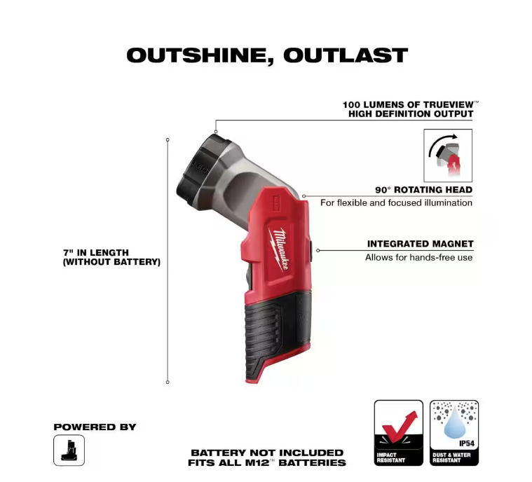 Milwaukee M12 12V Lithium-Ion Cordless 100 Lumens LED Work Flashlight, Tool-Only 49-24-0146