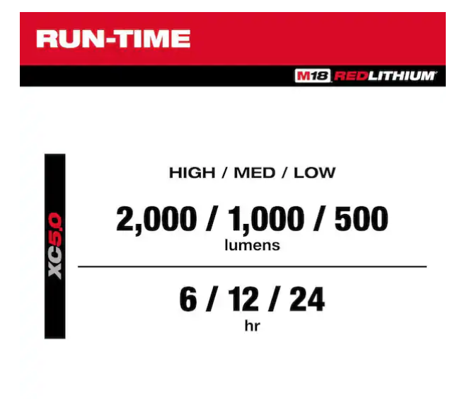 - 3 Modes: High: 2,000 - Lumens - 6 hrs; Medium: 1,000 - Lumens - 12hrs; Low: 500 - Lumens - 24hrs.