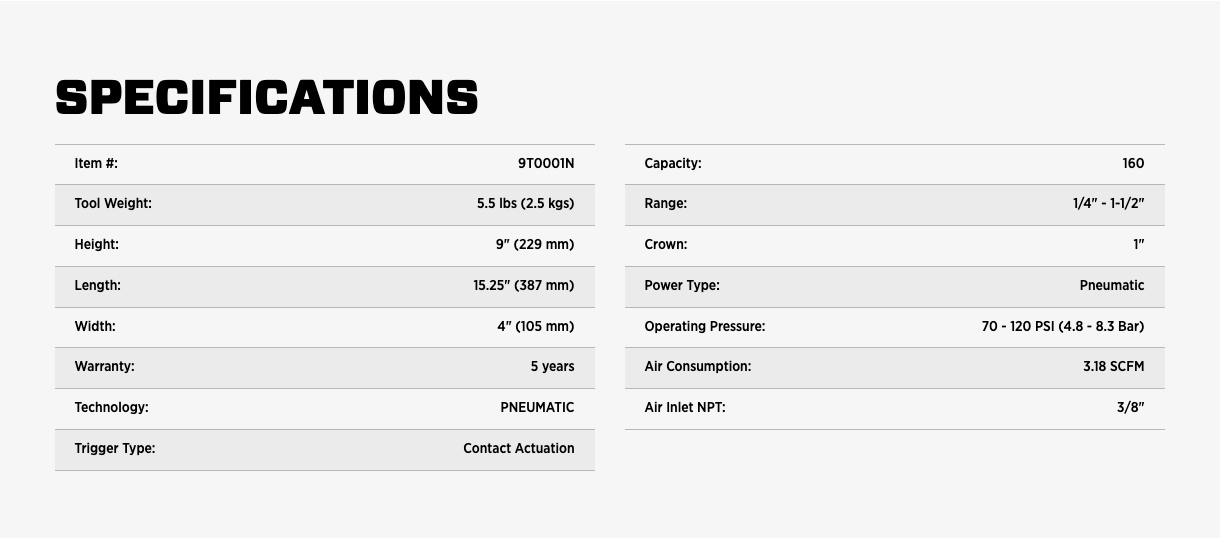 - Robust firing valve design makes the tool fast, powerful, efficient, and easy to maintain.